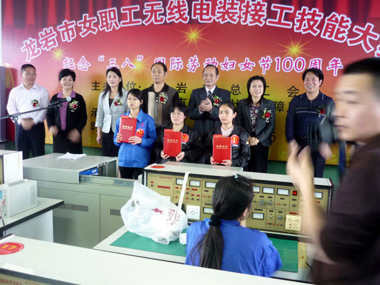 3月5日到6日,市總工會(huì)和市勞動(dòng)和社會(huì)保障局在龍巖技師學(xué)院舉辦龍巖市女職工無(wú)線(xiàn)電裝接工技能大賽。市直及各縣(市、區(qū))11個(gè)代表團(tuán)30多家電子行業(yè)的2萬(wàn)名女職工(農(nóng)民工)參與比賽。
