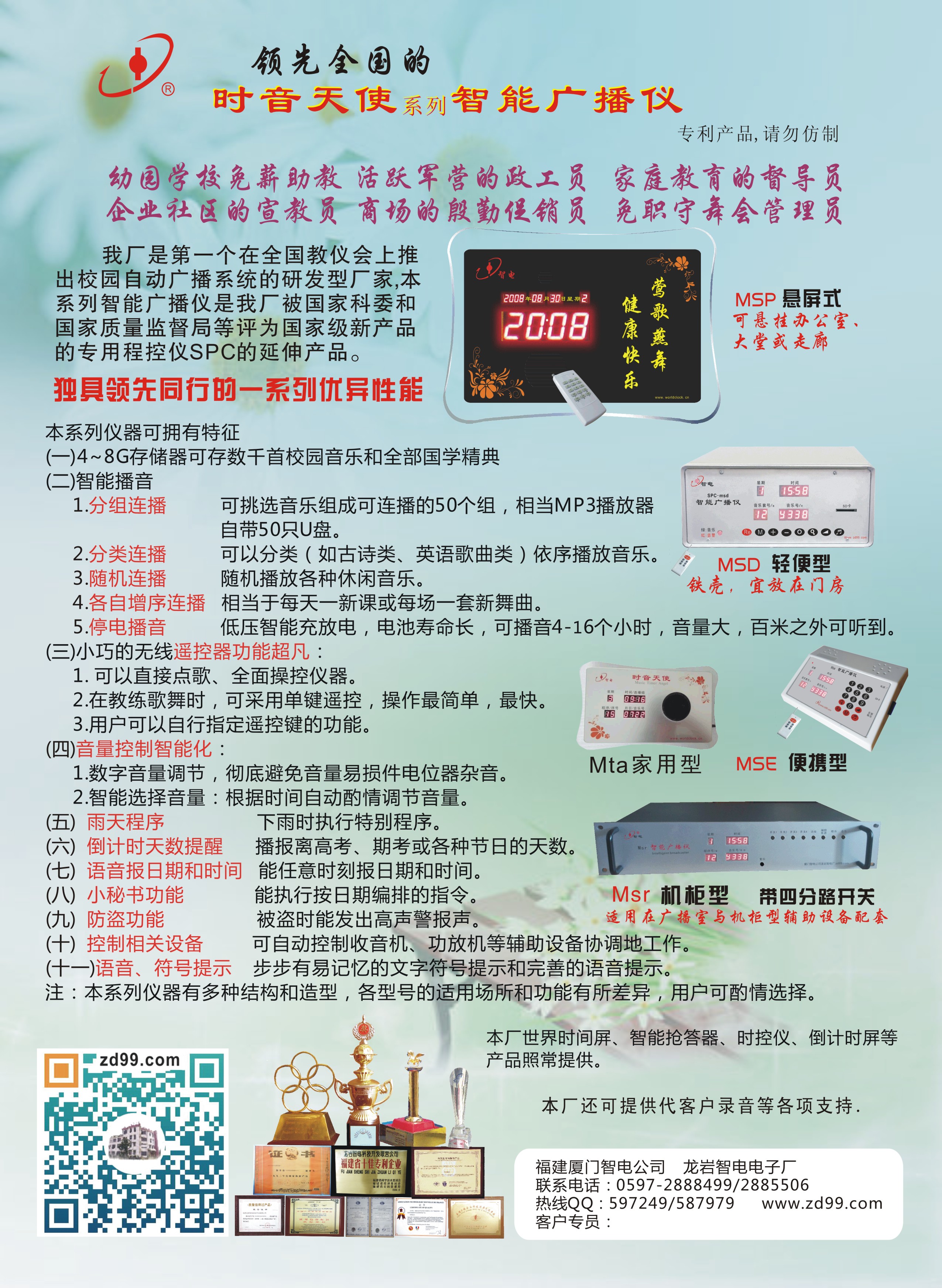 智電電子專業(yè)生產(chǎn):世界地圖時(shí)間鐘,世界時(shí)間地圖鐘,賓館酒店世界鐘,世界時(shí)間鐘,部隊(duì)自動廣播系統(tǒng),軍號儀,軍號播放器,校園自動廣播系統(tǒng),音樂定時(shí)播放器,倒計(jì)時(shí)鐘,打鈴器,電子搶答器,全自動水位控制器,定時(shí)開關(guān)控制器,等電子自動化控制設(shè)備